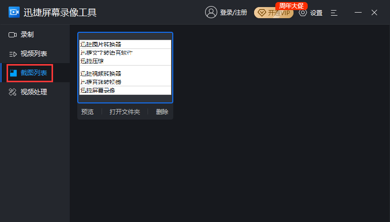 点击「截图列表」按钮,录屏过程中截取的图片会依次显示,可预览、打开文件夹、删除图片。